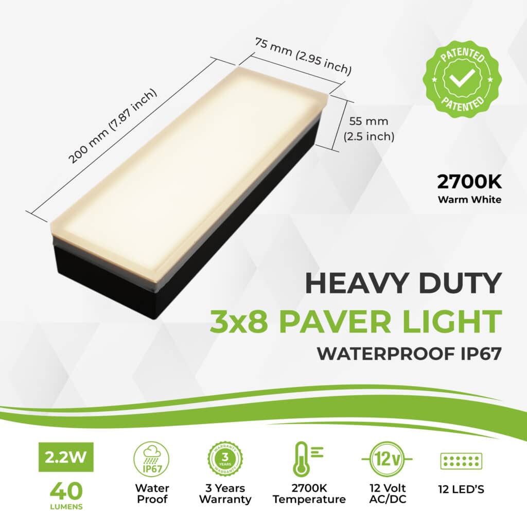 Paver Light 3×8 Inch, 2700K Brick Lighting For Pavers, Driveway, Pathway Patio, & Garden, 12V Waterproof IP67, Drive-Over Rated